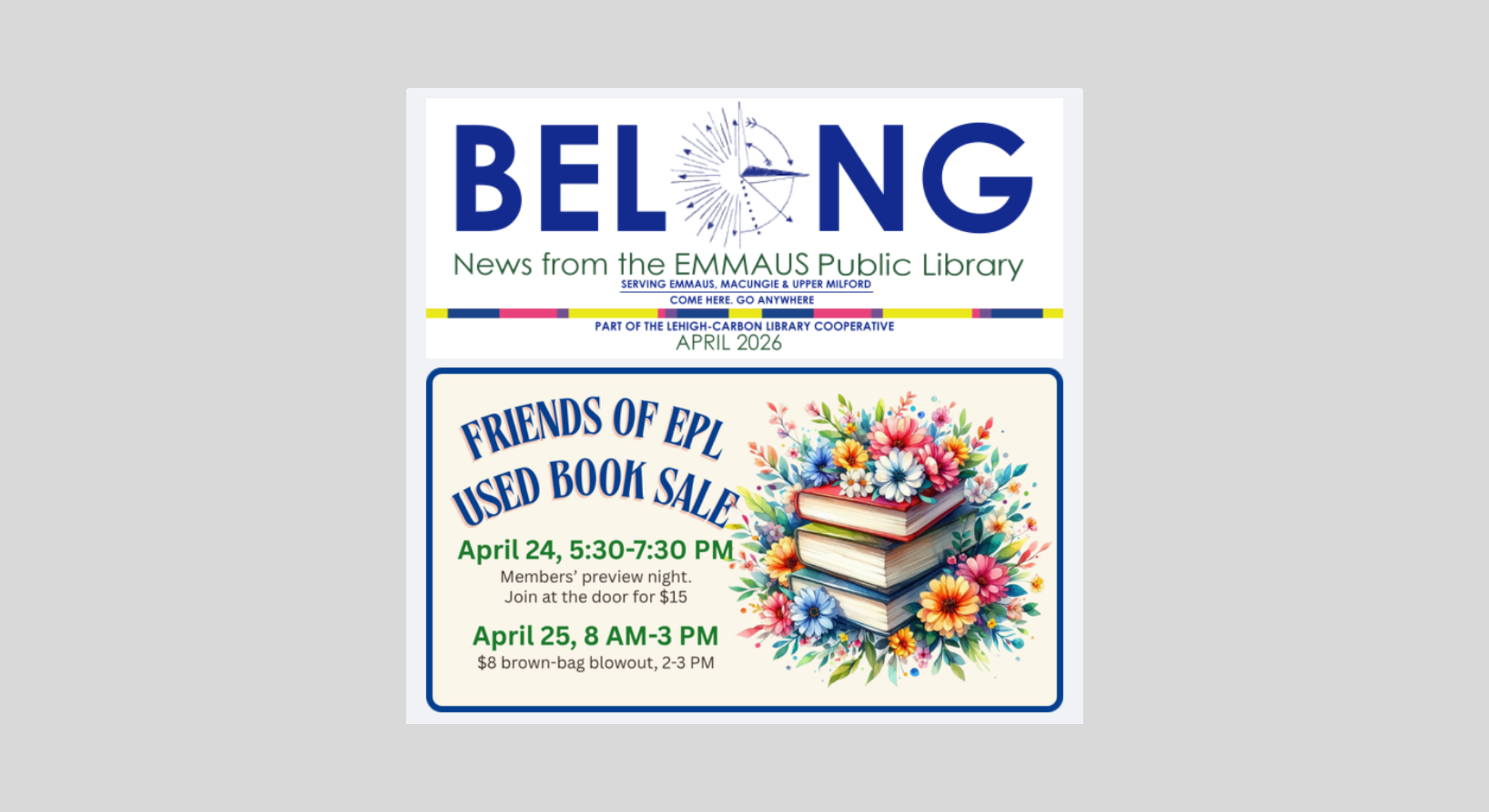 You can start your library card sign up online anytime or stop in when the library is open. Bring your valid photo ID, proof of residency if you have recently moved and your ID hasn't been updated yet (like a...Read MoreLCLC Cards are HEREWe're ready to issue you a shiny new card! Please bring your old card and a valid photo ID when you stop in, we'll update any info that may be out of date and get your new card ready to...Read MoreTax FormsThe Emmaus Public Library receives a small quantity of tax forms each year. These forms are intended for personal use, please take only what you need.