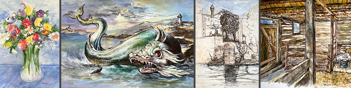 Margie’s preferred medium is pen (nibs) and ink with the addition of watercolor. However, she does utilize acrylic and more recently, is exploring the medium of oil. She has a passion for drawing trees, and loves the light of landscape and flower paintings. She is presently studying figure and portrait painting.