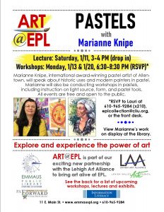 Workshops ~ Jan. 13 and 20, 6:30-8:30 p.m. (please RSVP*) ~ Marianne will be conducting workshops in pastels, including instruction on light source, form, and pastel tools. Registration is required. *Email Lauri at [email protected] or call the library at 610-965-9284 (x210).
