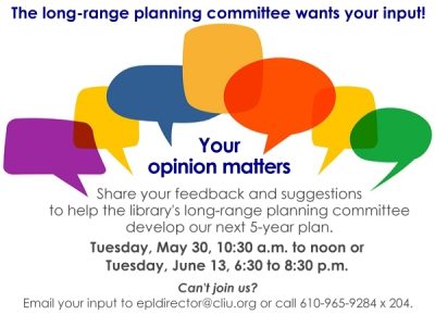 If you can’t join us in person, please email your suggestions to Library Director Maryellen Kanarr ([email protected]) or call her at 610-964-9284 x204. Your opinion is appreciated.