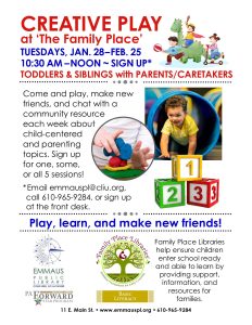 Join us for Creative Play at The Family Place — for toddlers (ages 1-3), their siblings, and adults! Five Tuesday mornings — February 28 through February 25, 10:30 a.m.-noon. Attend one, some, or all five sessions!