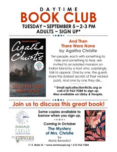 *RSVP: Email [email protected] or call 610-965-9284 to sign up. Some copies available to borrow at the front desk. Also available as a Libby ebook and audiobook, and as a Hoopla ebook and audiobook.