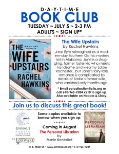Join us to discuss The Wife Upstairs by Rachel Hawkins in the Margaret Knoll Gardner Lecture Room.