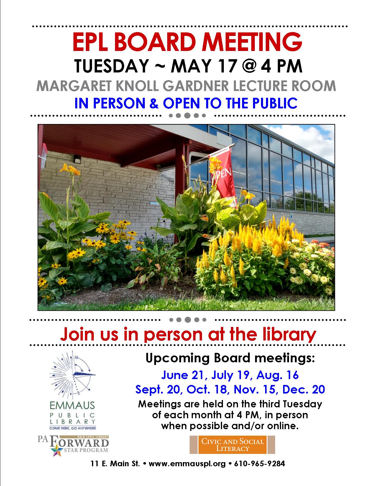 The May board meeting will be held in person in the Margaret Knoll Gardner Lecture Room.