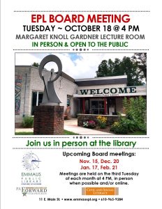 The October board meeting will be held in person in the Margaret Knoll Gardner Lecture Room.