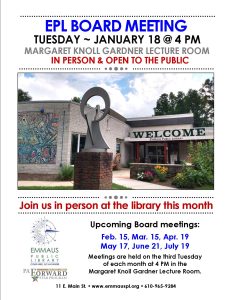 The January board meeting will be held in person in the Margaret Knoll Gardner Lecture Room. Meetings are open to the public.