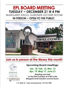 The December Emmaus Public Library board meeting will be held in-person in the Margaret Knoll Gardner Lecture Room. Meetings are open to the public.