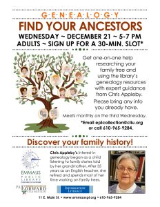 Get one-on-one help researching your family tree and using the library’s genealogy resources with expert guidance from Chris Appleby.