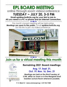 The July Emmaus Public Library board meeting will be held online via Zoom videoconference. Meetings are open to the public.