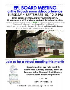This month’s Emmaus Public Library board meeting will be held online via zoom videoconference. Meetings are open to the public.