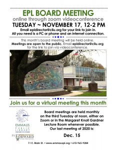 This month’s Emmaus Public Library board meeting will be held online via zoom videoconference. Meetings are open to the public.