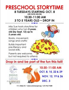 Miss Sue hosts storytime for children who turn 3 years old (by Sept. 12) up to 5 years old.
