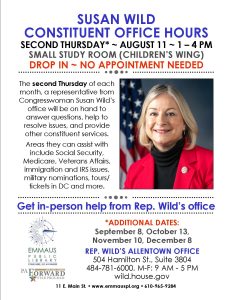 The second Thursday of each month, a representative from Congresswoman Susan Wild’s office will be on hand to answer questions, help to resolve issues, and provide other constituent services.