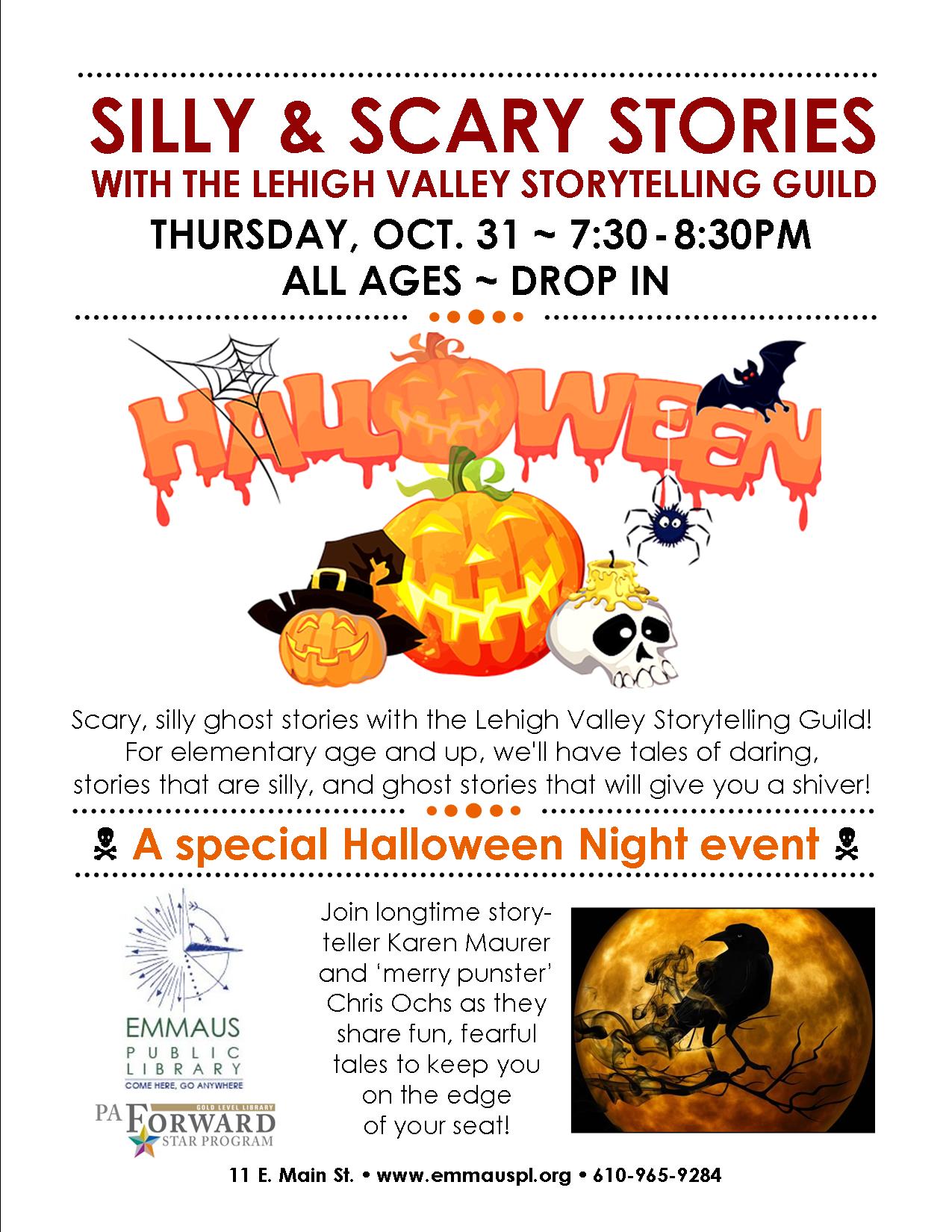 We’ll be handing out treats and hosting a special hour of silly and scary stories with two great storytellers from the Lehigh Valley Storytelling Guild — Karen Maurer and ‘merry punster’ Chris Ochs.