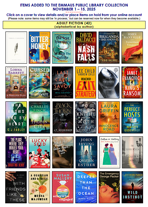 See/download our latest additions and click on a cover for details or to reserve items from your account online for quick pickup at the desk.