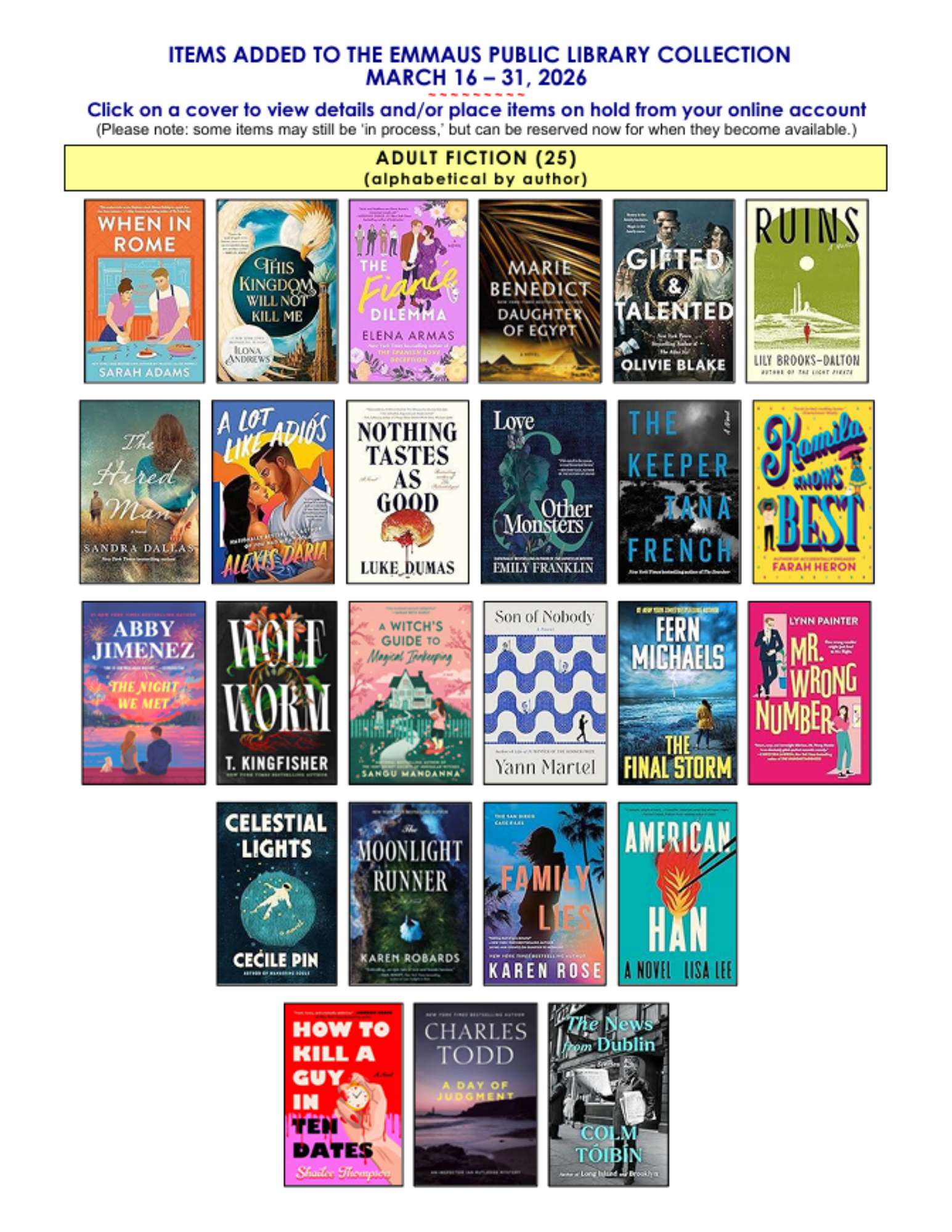 See/download our latest additions and click on a cover for details or to reserve items from your account online for quick pickup at the desk.