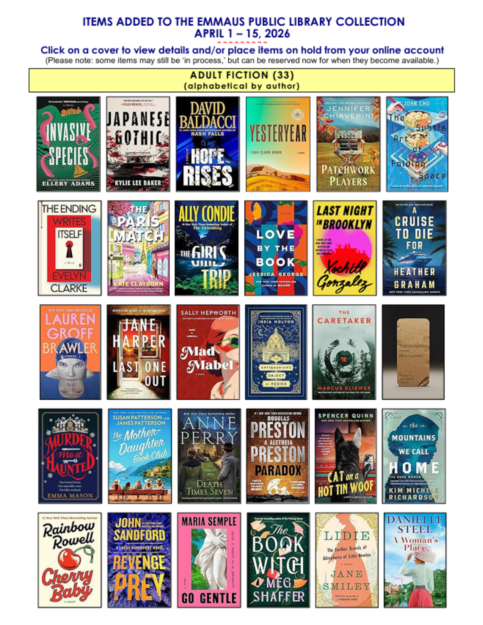 See/download our latest additions and click on a cover for details or to reserve items from your account online for quick pickup at the desk.