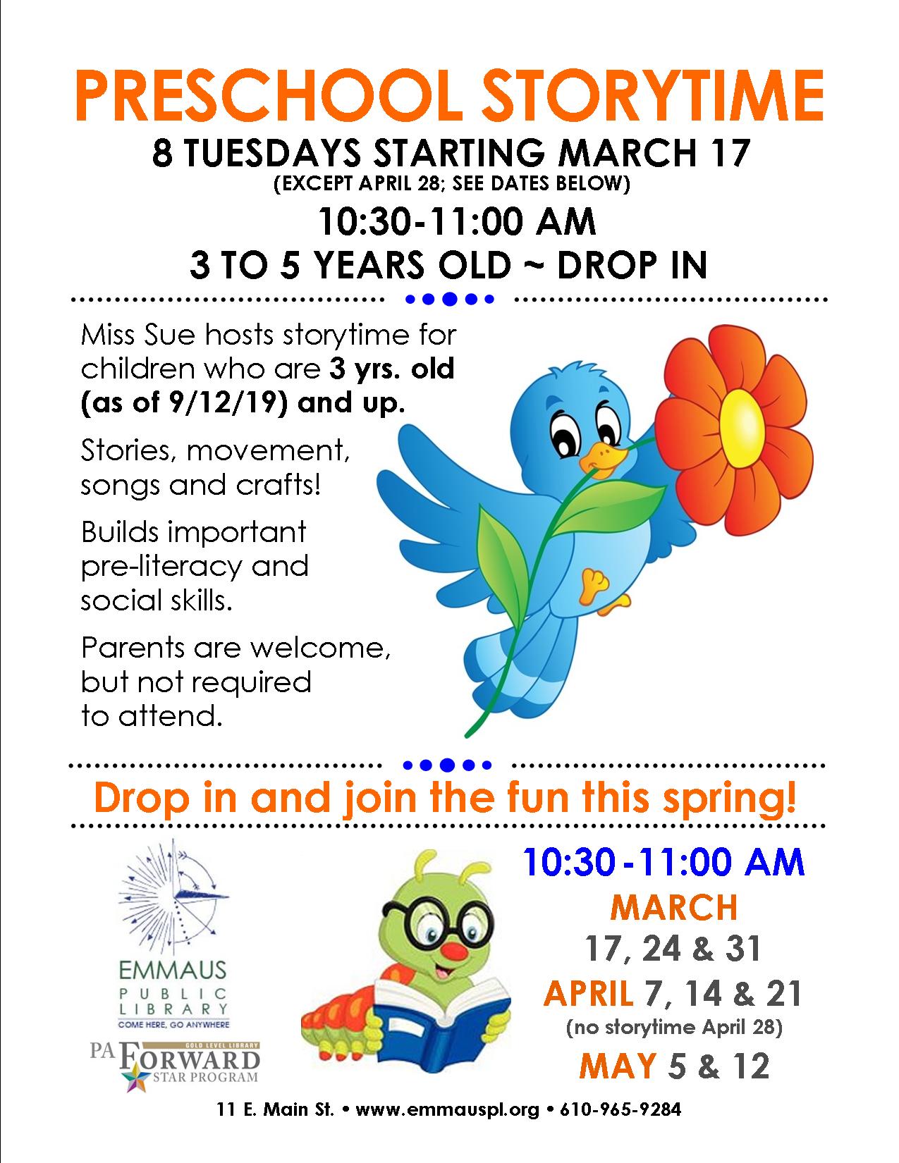 Right on the heels of winter storytime, Miss Sue is hopping into spring with another eight weeks of terrific tales, fun crafts and movement for little ones.