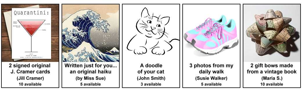 Have a great recipe (food or cocktail)? That can be your offer. Always telling jokes? Write down your top 10 and that can be your offer. Love to write? Offer to write an original haiku You get the idea. We’re looking for simple — something you would enjoy receiving. One offer, or if you’re inspired, have at it.